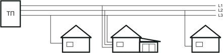 На рисунке представлен типовой вариант питания загородного поселка. На входе установлен понижающий трансформатор (трансформаторная подстанция). До недавнего времени потребление электроэнергии на один дом составляло от 2 до 5 кВА, но в последнее время с появлением теплых полов, электросаун, электрокотлов и прочей бытовой техники, требующей значительно большего энергопотребления, мощность нагрузочной сети на один дом нередко достигает 30 – 60 кВА. В большинстве случаев ни трансформаторная подстанция, ни линии электропитания не рассчитаны на возросшее количество энергоемких потребителей. Если еще учесть общее ветхое состояние электросети, то становятся понятными причины возникновения проблем с обеспечением электричеством.