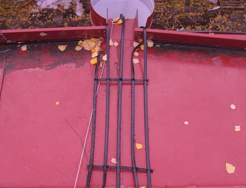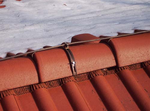 Гораздо сложнее закрепить зажимы на крутых крышах покрытых керамической черепицей. На таких крышах используют коньковые зажимы, форма и размеры которых подходит по ширине к коньковой черепице. На кровельном скате крутой крыши зажимы прибивают к рейкам или приклеивают морозостойким и водостойким клеем к черепице. Зажимы можно приклеивать к плоской, вогнутой или выпуклой крыше, используя при этом разное количество клея. Кстати, зажимы не испортят внешний вид вашей кровли, поскольку они могут быть выполнены в цвете черепицы.