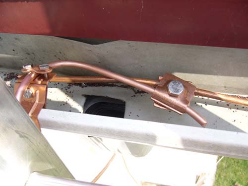 Такие молниеприемники на плоской крыше оборудуют специальными дистанционными элементами (например, пластиковыми кронштейнами, утяжеленными бруском из морозоустойчивого бетона), которые сдерживают их на определенном расстоянии от поверхности крыши. Если крыша покрыта рубероидом, такие кронштейны можно приклеивать мастикой. Токоотводы и молниеприемники нужно связать между собой и с элементами дома с помощью специальных винтовых зажимов. Они изготавливаются из оцинкованной стали, латуни и меди, могут быть крестообразными или желобчатыми. Вторые используют для соединения металлических желобов с молниеприемником.