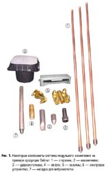 Любая система модульного стержневого заземления состоит, в сущности, из небольшого набора основных компонентов (рис.1). Продукция разных торговых марок различается лишь вариациями конструкции и ассортиментом аксессуаров. В состав системы входят:
