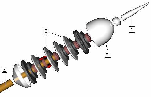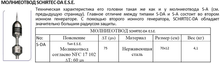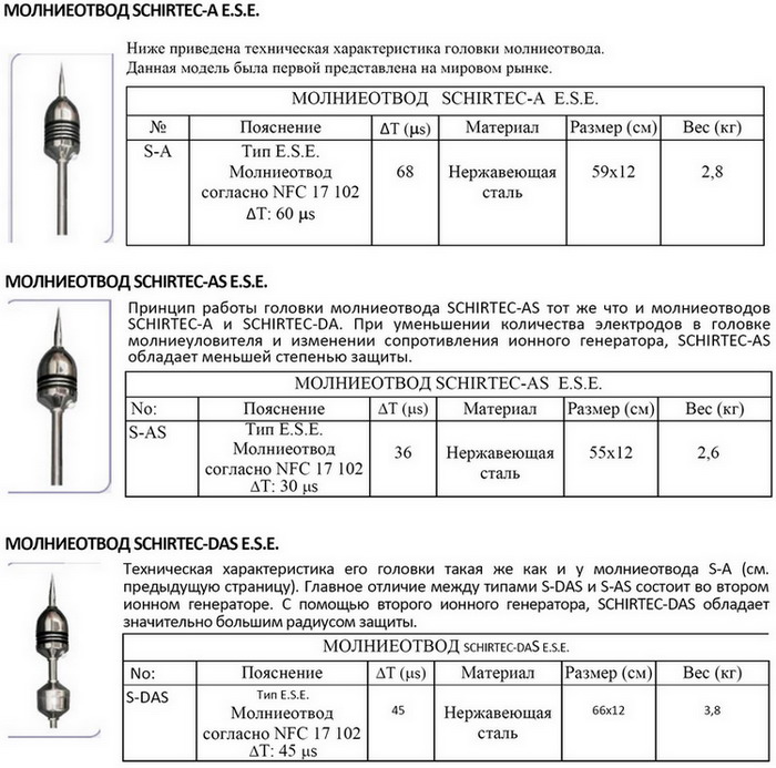 Если при установке обычных систем дом приходится «опутывать» проводами, то при активной системе всё намного проще, поскольку всё решается установкой над крышей одной головки активного молниеотвода. Если здание большое, то такое «опутывание» – дорогостоящее мероприятие, особенно, если на кровле здания в качестве молниеотвода укладывается металлическая сетка. Выглядит он гораздо эстетичней, что имеет значение для зданий с архитектурными концепциями, и, в итоге, оказывается более экономичным в эксплуатации, ведь уход за активным громоотводом намного проще, чем за обычным, так как нет необходимости контролировать множество соединений, которые в течение зимы под воздействием снега и льда могли повредиться и нуждаются в восстановлении. В зависимости от типа головки активного молниеотвода и высоты, на которой она установлена, радиус территории, защищаемой таким молниеотводом, может составлять 107 метров, а потому защищёнными будут не только дом, но и стоящий рядом с ним автомобиль, а также постройки. Зона защиты активного молниеприемника существенно превосходит зону защиты обычного штыревого. Это означает, что там, где по классическим схемам защиты необходимо выстраивать сложную систему штыревых молниеприемников, достаточно поставить один активный молниеотвод и уровень защиты будет как минимум на том же уровне, что и по классической схеме. Каталог товаров по системе Молниезащите смотрите - здесь Заявки на проектирование и монтаж систем молниезащиты, грозозащита, расчет заземления, контур заземления дома, измерение заземления принимаются по телефонам: (096) 819 70 03 Производство компании SCHIRTEC – это гарантированное качество (аккредитация до ISO –9001), что означает детализированную разработку на каждом этапе всего производства. Компания SCHIRTEC гордится высоким качеством своих товаров, которое оценено в соответствии с Европейскими стандартами. Благодаря использованию последних новейших технологий, мы завоевали стабильную уверенность со стороны наших клиентов, и мы всегда рады предоставить наши знания и помощь в нужной им сфере. Молниеотводы SCHIRTEC типа E.S.E. характеризуются тем, что они не содержат адиоактивных элементов и при этом защищают значительное пространство из одной точки, активизируясь при риске поражения молнией благодаря эффекту возрастания напряжённости электрического поля в атмосфере в грозовую погоду. Главная часть молниеотвода E.S.E. состоит из четырёх основных деталей: 1. Молниеуловитель 2. Ионный генератор 3. Ускоритель заряженных частиц и атмосферные электроды 4. Вывод заземляющего устройства Рисунок 1. Детали молниеотвода SCHIRTEC E.S.E. Молниеуловитель имеет достаточные размеры и качество, чтобы выдержать удар самой мощной молнии. Ионный генератор, индукционная катушка и предохранитель обладают высоким сопротивлением. Ионный генератор покрыт специальной эпоксидной смолой, защищающей его от внешней среды. Ускоритель заряженных частиц и атмосферные электроды спроектированы таким образом, что могут заряжаться разными электрическими потенциалами, благодаря чему предназначение молниеотвода – заставить электроды работать и как ресурс, вырабатывающий дополнительную ионизацию, и как ускоритель заряженных частиц. Регулировка выполняется через сопротивление ряда электродов и ионного генератора, см. различные