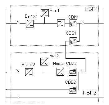 Рис. 19а. Последовательное соединение двух трехфазных ИБП. На рисунке 19а приведена схема двух последовательно соединенным трехфазных ИБП. Для упрощения на рисунке приведена, так называемая, однолинейная схема, на которой трем проводам трехфазной системы переменного тока соответствует одна линия. Однолинейные схемы часто применяются в случаях, когда особенности трехфазной сети не накладывают отпечаток на свойства рассматриваемого прибора. Оба ИБП постоянно работают. Основной ИБП питает нагрузку, а вспомогательный ИБП работает на холостом ходу. В случае выхода из строя основного ИБП, нагрузка питается не от статического байпаса, как в обычном ИБП, а от вспомогательного ИБП. Только при выходе из строя второго ИБП, нагрузка переключается на работу от статического байпаса. Система из двух последовательно соединенных ИБП может работать на шести основных режимах. А.Нормальная работа. Выпрямители 1 и 2 питают инверторы 1 и 2 и, при необходимости заряжают батареи 1 и 2. Инвертор 1 подключен к нагрузке (статический выключатель инвертора 1 замкнут) и питает ее стабилизированным и защищенным от сбоев напряжением. Инвертор 2 работает на холостом ходу и готов "подхватить" нагрузку, если инвертор 1 выйдет из строя. Оба статических выключателя байпаса разомкнуты. Б. Работа от батареи 1. Выпрямитель 1 не может питать инвертор и батарею. Чаще всего это происходит из-за отключения напряжения в электрической сети, но причиной может быть и выход из строя выпрямителя. Состояние инвертора 2 в этом случае зависит от работы выпрямителя 2. Если выпрямитель 2 работает (например он подключен к другой электрической сети или он исправен, в отличие от выпрямителя 1), то инвертор 2 также может работать, но работать на холостом ходу, т.к. он "не знает", что с первым ИБП системы что-то случилось. После исчерпания заряда батареи 1, инвертор 1 отключится и система постарается найти другой источник электроснабжения нагрузки. Им, вероятно, окажется инвертор2. Тогда система перейдет к другому режиму работы. В. Работа от инвертора 2. В этом случае инвертор 1 не работает (из-за выхода из строя или полного разряда батареи1). СВИ1 разомкнут, СВБ1 замкнут, СВИ2 замкнут и инвертор 2 питает нагрузку. Выпрямитель 2, если в сети есть напряжение, а сам выпрямитель исправен, питает инвертор и батарею. Г. Работа от батареи 2. Наиболее часто такая ситуация может возникнуть после отключения напряжения в сети и полного разряда батареи 1. Можно придумать и более экзотическую последовательность событий. Но в любом случае, инвертор 2 питает нагругку, питаясь, в свою очередь, от батареи. Инвертор 1 в этом случае отключен. Выпрямитель 1, скорее всего, тоже не работает (хотя он может работать, если он исправен и в сети есть напряжение). Д. Работа через статический байпас. В случае выхода из строя обоих инверторов, статические переключатели СВИ1 и СВИ2 размыкаются, а статические переключатели СВБ1 и СВБ2 замыкаются. Нагрузка начинает питаться от электрической сети. Е. Ручной (сервисный) байпас. Если ИБП вышел из строя, а ответственную нагрузку нельзя обесточить, то оба ИБП системы с соблюдением специальной процедуры (которая обеспечивает безразрыное переключение) переключают на ручной байпас. после этого можно производить ремонт ИБП. Преимуществом рассмотренной системы с последовательным соединением двух ИБ