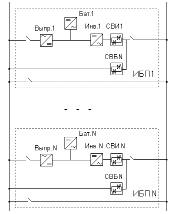 Рис.20. Параллельная работа ИБП На рисунке приведена схема параллельной системы с раздельными сервисными байпасами. Схема система с общим байпасом вполне ясна и без чертежа. Ее особенностью является то, что для переключения системы в целом на сервисный байпас нужно управлять одним переключателем вместо нескольких. На рисунке предполагается, что между ИБП 1 и ИБП N Могут располагаться другие ИБП. Разные производителю (и для разных моделей) устанавливают свои максимальные количества параллеьно работающих ИБП. Насколько мне известно, эта величина изменяется от 2 до 8. Все ИБП параллельной системы работают на общую нагрузку. Суммарная мощность параллельной системы равна произведению мощности одного ИБП на количество ИБП в системе. Таким образом параллельная работа нескольких ИБП может применяться (и в основном применяется) не столько для увеличения надежности системы бесперебойного питания, но для увеличения ее мощности. Рассмотрим режимы работы параллельной системы. Нормальная работа (работа от сети). Надежность Когда в сети есть напряжение, достаточное для нормальной работы, выпрямители всех ИБП преобразуют переменное напряжение сети в постоянное, заряжая батареи и питая инверторы. Инверторы, в свою очередь, преобразуют постоянное напряжение в переменное и питают нагрузку. Специальная управляющая электроника параллельной системы следит за равномерным распределением нагрузки между ИБП. В некоторых ИБП распределение нагрузки между ИБП производится без использования специальной параллельной электроники. Такие приборы выпускаются "готовыми к параллельной работе", и для использования их в параллельной системе достаточно установить плату синхронизации. Есть и ИБП, работающие параллельго без специальной электроники. В таком случае количество параллельно работающих ИБП - не более двух. В рассматриваемом режиме работы в системе допустимо несколько сбоев. Их количество зависит от числа ИБП в системе и действующей нагрузки. Пусть в системе 3 ИБП мощностью по 100 кВА, а нагрузка равна 90 кВА. При таком соотношении числа ИБП и их мощностей в системе допустимы следующие сбои. Сбой питания (исчезновение напряжения в сети). Выход из строя любого из инверторов, скажем для определенности, инвертора 1. Нагрузка распределяется между двумя другими ИБП. Если в сети есть напряжение, все выпрямители системы работают Выход из строя инвертора 2. Нагрузка питается от инвертора 3, поскольку мощность, потребляемая нагрузкой меньше мощности одного ИБП. Если в сети есть напряжение, все выпрямители системы продолжают работать. Выход из строя инвертора 3. Система переключается на работу через статический байпас. Нагрузка питается напрямую от сети. При наличии в сети нормального напряжения, все выпрямители работают и продолжают заряжать батареи. При любом последующем сбое (поломке статического байпаса или сбое сети) питание нагрузки прекращается. Для того, чтобы параллельная система допускала большое число сбоев, система должна быть сильно недогружена и должна включать большое число ИБП. Например, если нагрузка в приведенном выше примере будет составлять 250 кВА, то система допускает только один сбой: сбой сети или поломку инвертора. В отношении количества допустимых сбоев такая система эквивалентна одиночному ИБП. Это, кстати, не значит, что на