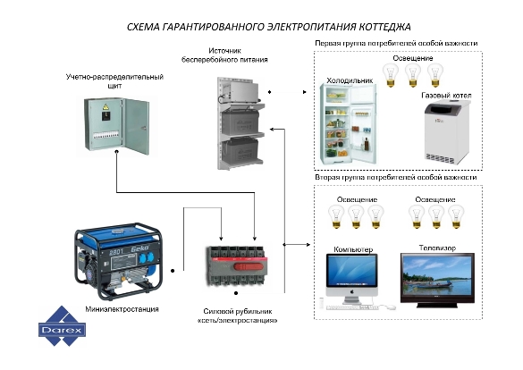 Электрическая нагрузка (в том числе и системы жизнеобеспечения объекта) имеют различную степень важности. Например, морозильная камера может в зимнее время держать необходимую температуру до 8 часов, в тоже время при останове системы теплоснабжения коттедж остывает за несколько часов. Таким образом, есть системы, перерыв в функционировании которых даже на непродолжительный срок приводит к значительным неудобствам, или приводит к большим материальным убыткам. К таким системам в первую очередь следует отнести систему теплоснабжения и аварийного освещения, причем эти системы как правило укладываются в величину мощности 2,5 кВт (при условии их грамотного построения). Остальная электрическая нагрузка может вполне функционировать от стабилизатора напряжения, а в случае перерыва электроснабжения на время до нескольких суток в зимнее время можно «перетерпеть» без этих устройств, тем самым снизив капитальные затраты на систему в целом.